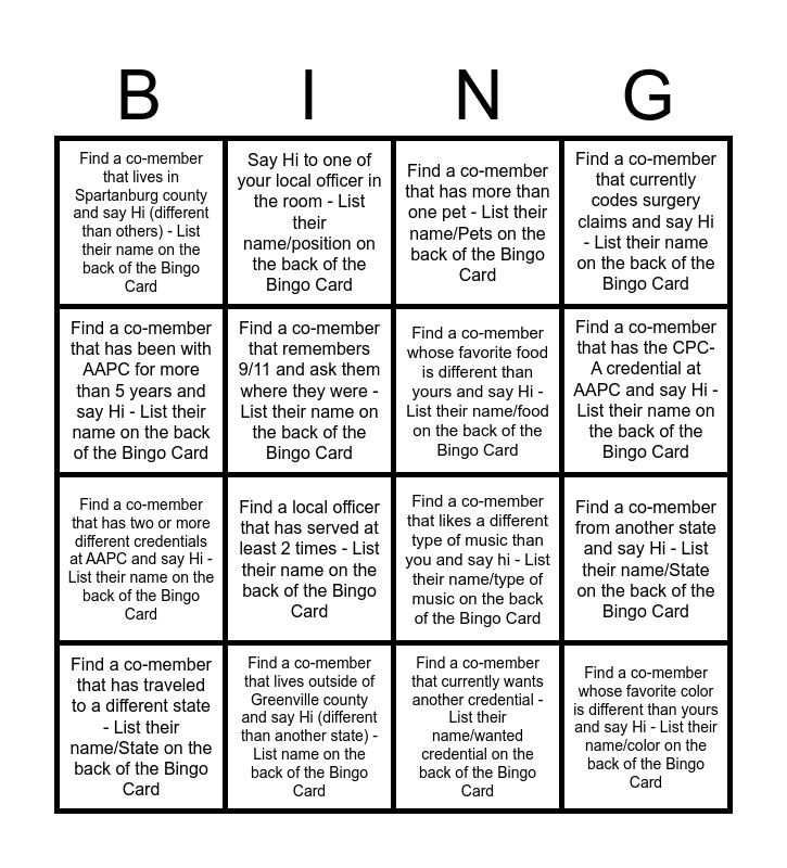This bingo card has 20 words: Find a co-member from another state and say Hi - List their name/State on the back of the Bingo Card, Find a co-member that has a pet other than a cat or dog - List their name/Pet type on the back of the Bingo Card, Find a co-member that has more than one pet - List their name/Pets on the back of the Bingo Card, Say Hi to a co-member in a different area of the room than you are in - List their name on the back of the Bingo Card, Find a co-member that has traveled to a different state - List their name/State on the back of the Bingo Card, Find a co-member that has been with AAPC for more than 5 years and say Hi - List their name on the back of the Bingo Card, Find a co-member that lives outside of Greenville county and say Hi (different than another state) - List name on the back of the Bingo Card, Find a co-member that lives in Spartanburg county and say Hi (different than others) - List their name on the back of the Bingo Card, Find a co-member that has two or more different credentials at AAPC and say Hi - List their name on the back of the Bingo Card, Say Hi to one of your local officer in the room - List their name/position on the back of the Bingo Card, Find a local officer that has served at least 2 times - List their name on the back of the Bingo Card, Find a co-member that likes a different type of music than you and say hi - List their name/type of music on the back of the Bingo Card, Find a co-member that remembers 9/11 and ask them where they were - List their name on the back of the Bingo Card, Find a co-member whose favorite color is different than yours and say Hi - List their name/color on the back of the Bingo Card, Find a co-member whose favorite food is different than yours and say Hi - List their name/food on the back of the Bingo Card, Find a co-member who has a hobby that is different than you yours and say Hi - List their name/hobby on the back of the Bingo Card, Find a co-member that has the CPC-A credential at AAPC and say Hi - List their name on the back of the Bingo Card, Find a co-member that currently codes surgery claims and say Hi - List their name on the back of the Bingo Card, Find a co-member that currently wants another credential - List their name/wanted credential on the back of the Bingo Card and Find a co-member that currently codes Pain Management claims and say Hi - List their name on the back of the Bingo Card.