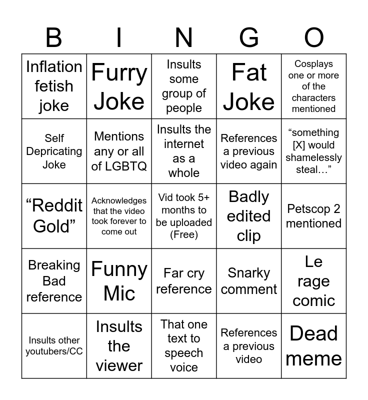 This bingo card has a free space and 26 words: Far cry reference, References a previous video, Insults the internet as a whole, Insults the viewer, Cosplays one or more of the characters mentioned, Inflation fetish joke, Self Depricating Joke, Furry Joke, Petscop 2 mentioned, Snarky comment, References a previous video again, “Reddit Gold”, Le rage comic, Insults other youtubers/CC, Acknowledges that the video took forever to come out, Dark Souls reference, Fat Joke, Breaking Bad reference, Insults some group of people, Dead meme, “something [X] would shamelessly steal…”, That one text to speech voice, Badly edited clip, Funny Mic, Mentions any or all of LGBTQ and Insults the creator of the thing discussed.