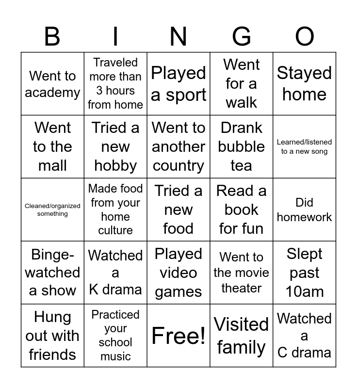 This bingo card has 25 words: Binge-watched a show, Practiced your school music, Tried a new food, Visited family, Stayed home, Went to academy, Traveled more than 3 hours from home, Played a sport, Read a book for fun, Slept past 10am, Went to the mall, Tried a new hobby, Free!, Went to the movie theater, Learned/listened to a new song, Hung out with friends, Made food from your home culture, Went to another country, Drank bubble tea, Did homework, Cleaned/organized something, Watched a K drama, Played video games, Went for a walk and Watched a C drama.