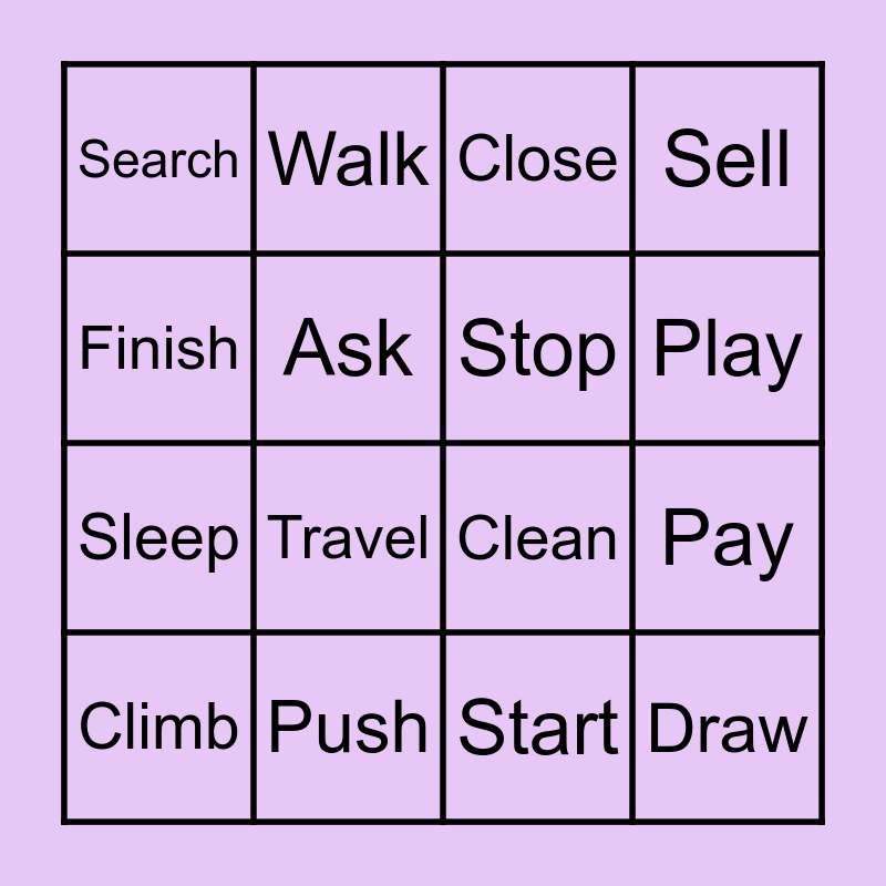 This bingo card has 60 words: Fly, Open, Devise, Draw, Remember, Read, Stop, Buy, Sleep, Dance, Sell, Run, Ask, Jump, Drive, Search, Climb, Finish, Study, Play, Push, Close, Write, Ride, Drink, Arrive, Wash, Pull, Travel, Feel, Laugh, Build, Swim, Cry, Walk, Converse, See, Pay, Throw, Clean, Love, Eat, Start, Work, Listen, Chat, Send, Paint, Learn, Help, Follow, Speak, Call, Rest, Think, Cook, Create, Sing, Smile and Win.