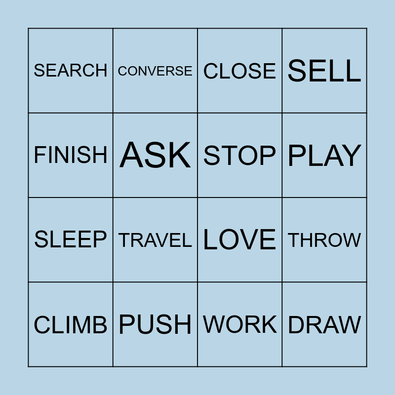This bingo card has 59 words: FLY, OPEN, DEVISE, DRAW, REMEMBER, READ, STOP, BUY, SLEEP, DANCE, SELL, RUN, ASK, JUMP, DRIVE, SEARCH, CLIMB, FINISH, STUDY, PLAY, PUSH, CLOSE, WRITE, RIDE, DRINK, ARRIVE, WASH, PULL, TRAVEL, FEEL, LAUGH, SWIM, CRY, WALK, CONVERSE, SEE, PAY, THROW, CLEAN, LOVE, EAT, START, WORK, LISTEN, CHAT, SEND, PAINT, LEARN, HELP, FOLLOW, SPEAK, CALL, REST, THINK, COOK, CREATE, SING, SMILE and WIN.