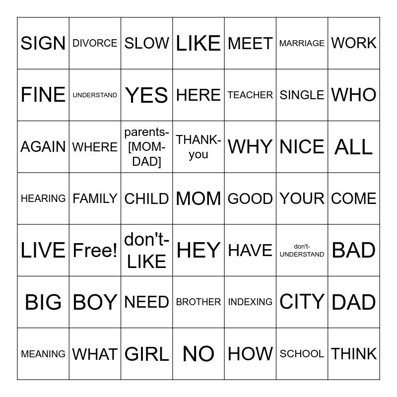 This bingo card has 70 words: again, AGAIN, DEAF, don't-UNDERSTAND, HEARING, LEARN, LIKE, MEANING, MEET, NAME, NICE, NO, SIGN, SLOW, STUDENT, TEACHER, THANK-you, UNDERSTAND, WHAT, WHERE, WHO, WHY, YES, YOUR, Free!, INDEXING, BOY, BROTHER, CHILD, DAD, DIVORCE, GIRL, GRANDMA, GRANDPA, HAVE, HEY, HOW, HOW-MANY, LIVE, MARRIAGE, MOM, parents-[MOM-DAD], SINGLE, SISTER, SPELL, WORK, ALL, BAD, BATHROOM, BIG, CITY, CLASS, COME, don't-LIKE, FAMILY, FAVORITE, FINE, FROM, GO, GOOD, HERE, HOUSE, MORE, NEED, SCHOOL, SO-SO, SMALL, THINK, RAISED and WANT.