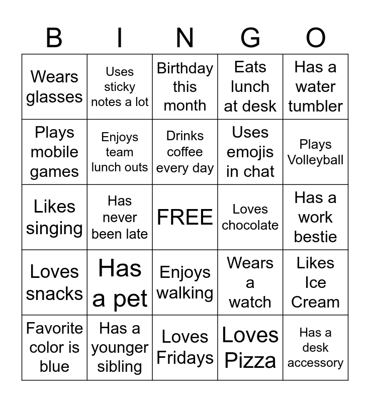 This bingo card has a free space and 24 words: Favorite color is blue, Has a pet, Drinks coffee every day, Loves Pizza, Has a water tumbler, Wears glasses, Uses sticky notes a lot, Birthday this month, Loves chocolate, Has a work bestie, Likes singing, Enjoys team lunch outs, Wears a watch, Likes Ice Cream, Plays mobile games, Has a younger sibling, Loves Fridays, Eats lunch at desk, Plays Volleyball, Loves snacks, Has never been late, Enjoys walking, Uses emojis in chat and Has a desk accessory.