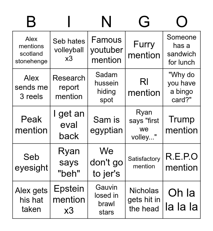 This bingo card has a free space and 24 words: Ryan says "beh", Epstein mention x3, Sadam hussein hiding spot, Alex gets his hat taken, Someone has a sandwich for lunch, Alex mentions scotland stonehenge, Alex sends me 3 reels, Seb hates volleyball x3, Ryan says "first we volley...", We don't go to jer's, Rl mention, Peak mention, Satisfactory mention, R.E.P.O mention, Research report mention, Nicholas gets hit in the head, Trump mention, Famous youtuber mention, "Why do you have a bingo card?", I get an eval back, Oh la la la la, Seb eyesight, Furry mention and Gauvin losed in brawl stars.