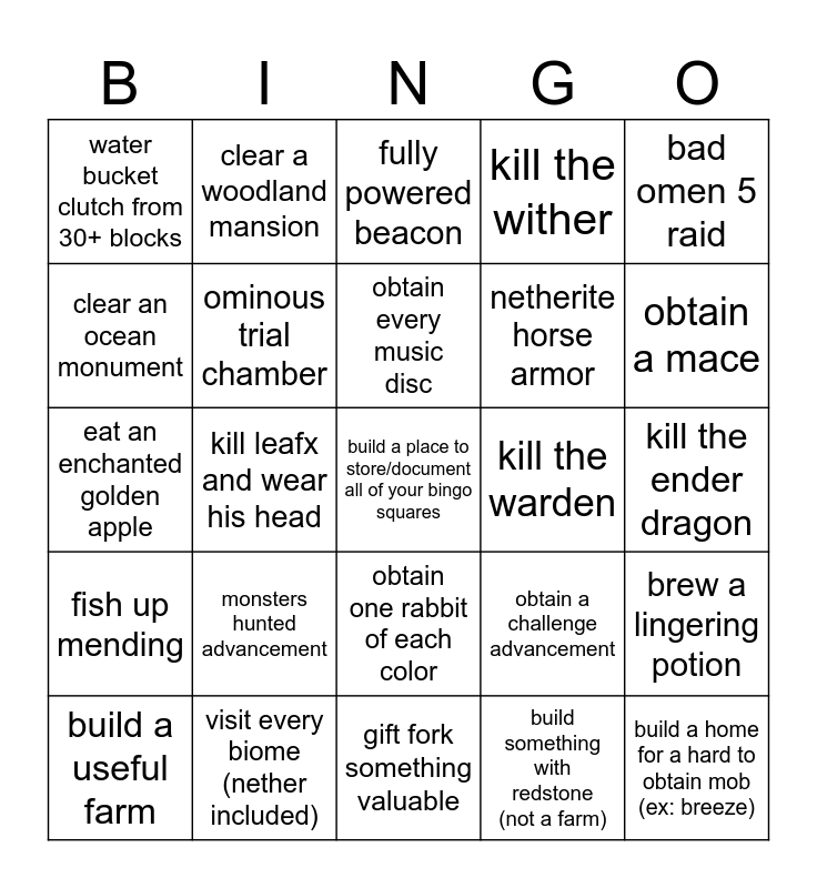 This bingo card has a free space and 24 words: monsters hunted advancement, visit every biome (nether included), obtain every music disc, build a useful farm, bad omen 5 raid, water bucket clutch from 30+ blocks, clear an ocean monument, clear a woodland mansion, kill the warden, obtain one rabbit of each color, netherite horse armor, eat an enchanted golden apple, obtain a challenge advancement, brew a lingering potion, ominous trial chamber, build something with redstone (not a farm), kill the ender dragon, fully powered beacon, obtain a mace, kill leafx and wear his head, build a home for a hard to obtain mob (ex: breeze), fish up mending, kill the wither and gift fork something valuable.