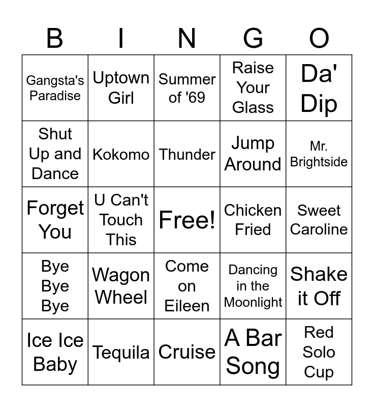 This bingo card has a free space and 29 words: Ice Ice Baby, Baby Got Back, U Can't Touch This, This is How We Do It, Gangsta's Paradise, Summer of '69, Kokomo, Wagon Wheel, Chicken Fried, Tequila, Sweet Caroline, Red Solo Cup, Cruise, A Bar Song, Mr. Brightside, Just a Friend, Come on Eileen, Bye Bye Bye, Da' Dip, Forget You, Dancing in the Moonlight, Hey, Soul Sister, Jump Around, Shut Up and Dance, Raise Your Glass, Uptown Girl, Shake it Off, Thunder and Hey Driver.