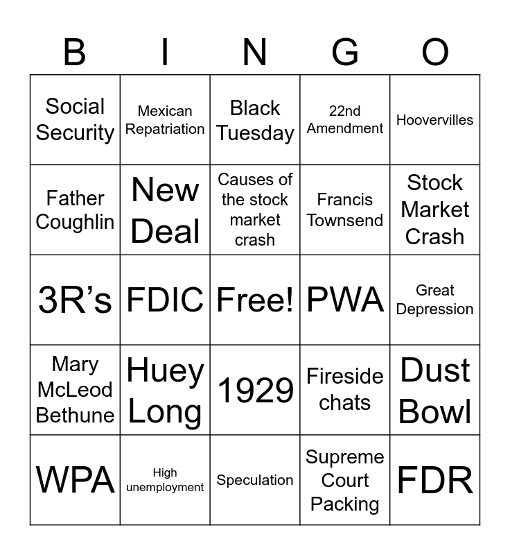 This bingo card has a free space and 31 words: Speculation, Bank Runs, FDIC, CCC, Social Security, Black Tuesday, New Deal, Fireside chats, PWA, Supreme Court Packing, Great Depression, FDR, TVA, Eleanor Roosevelt, Stock Market Crash, Herbert Hoover, Dust Bowl, Huey Long, Mary McLeod Bethune, 1929, Hoovervilles, American Individualism, WPA, Mexican Repatriation, Francis Townsend, Father Coughlin, 22nd Amendment, 3R’s, High unemployment, Causes of the stock market crash and John Steinbeck.