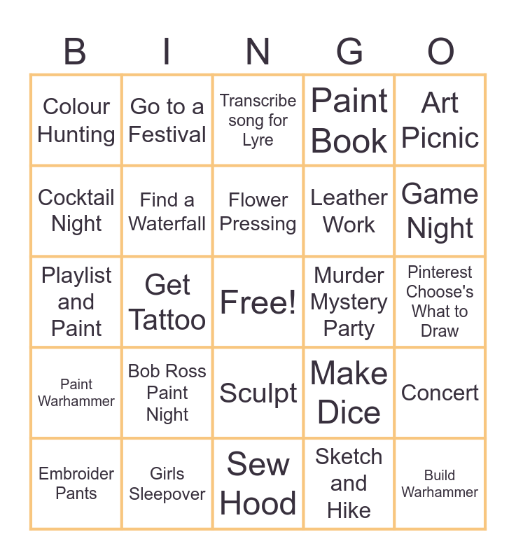 This bingo card has a free space and 24 words: Bob Ross Paint Night, Girls Sleepover, Flower Pressing, Embroider Pants, Art Picnic, Colour Hunting, Cocktail Night, Go to a Festival, Murder Mystery Party, Sculpt, Leather Work, Playlist and Paint, Make Dice, Concert, Find a Waterfall, Sketch and Hike, Pinterest Choose's What to Draw, Transcribe song for Lyre, Game Night, Get Tattoo, Build Warhammer, Paint Warhammer, Paint Book and Sew Hood.