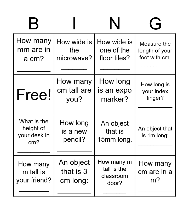 This bingo card has 16 words: An object that is 3 cm long: ________, An object that is 1m long: ___________, How wide is one of the floor tiles? ________, How many mm are in a cm? ________, What is the height of your desk in cm? __________, How wide is the microwave? _______, An object that is 15mm long. _______, How many m tall is the classroom door? _______, Free!, How many cm tall are you? ________, How many m tall is your friend? ________, Measure the length of your foot with cm. ___________, How long is a new pencil? _________, How long is your index finger? ___________, How long is an expo marker? ________ and How many cm are in a m? _________.