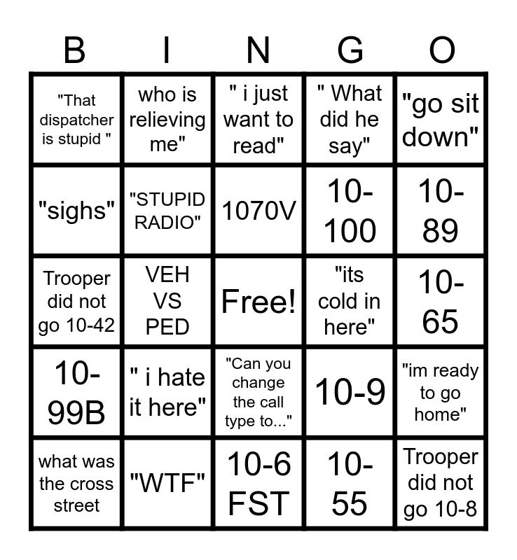 This bingo card has a free space and 24 words: what was the cross street, " i hate it here", 1070V, 10-55, "go sit down", "That dispatcher is stupid ", who is relieving me", " i just want to read", "its cold in here", 10-65, Trooper did not go 10-42, "STUPID RADIO", 10-9, "im ready to go home", "sighs", "WTF", 10-6 FST, " What did he say", 10-89, 10-99B, VEH VS PED, "Can you change the call type to...", 10-100 and Trooper did not go 10-8.