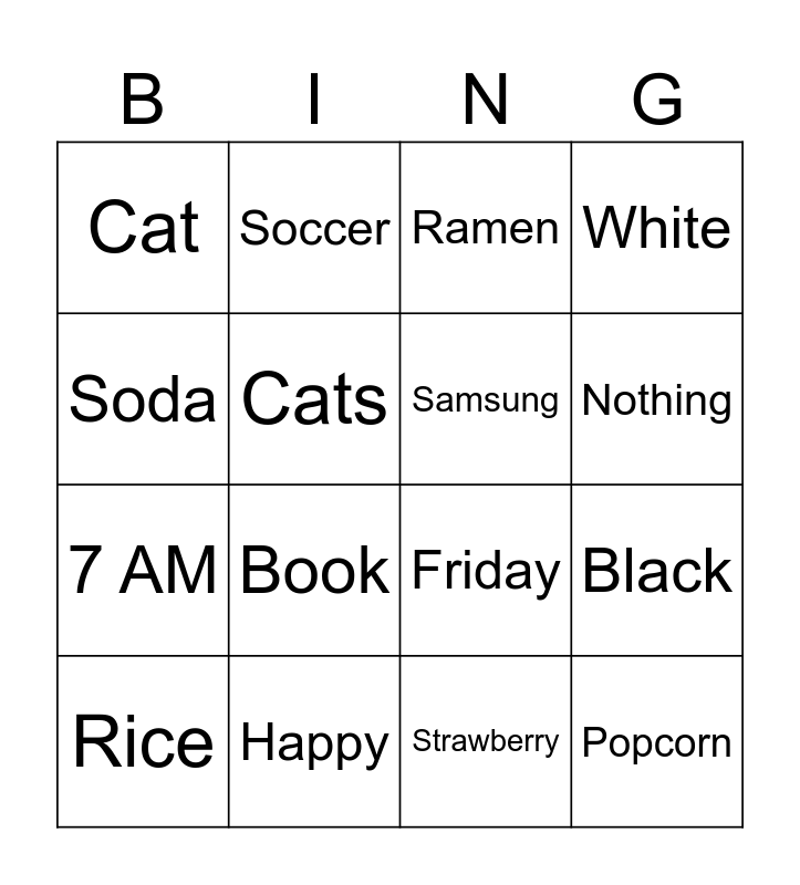 This bingo card has 16 words: Happy, Black, Ramen, Cat, 7 AM, Soccer, Friday, Strawberry, Soda, Cats, Rice, White, Book, Nothing, Samsung and Popcorn.