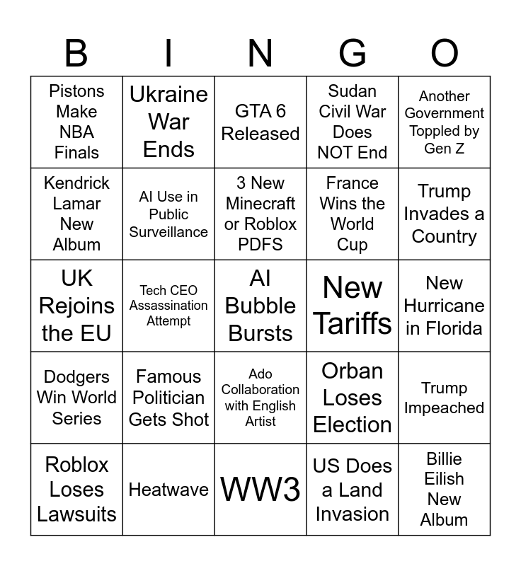 This bingo card has 25 words: Famous Politician Gets Shot, WW3, 3 New Minecraft or Roblox PDFS, Roblox Loses Lawsuits, Another Government Toppled by Gen Z, Pistons Make NBA Finals, Kendrick Lamar New Album, Ukraine War Ends, New Tariffs, Ado Collaboration with English Artist, France Wins the World Cup, UK Rejoins the EU, Orban Loses Election, Trump Impeached, AI Use in Public Surveillance, Billie Eilish New Album, New Hurricane in Florida, GTA 6 Released, Trump Invades a Country, Tech CEO Assassination Attempt, AI Bubble Bursts, Heatwave, Dodgers Win World Series, Sudan Civil War Does NOT End and US Does a Land Invasion.