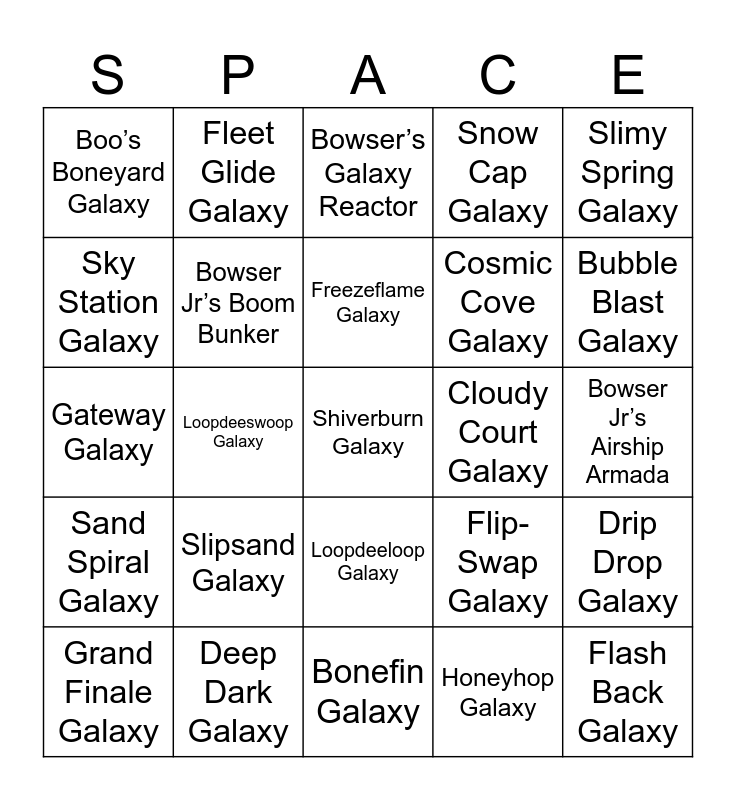 This bingo card has 91 words: Good Egg Galaxy, Honeyhive Galaxy, Loopdeeloop Galaxy, Flipswitch Galaxy, Bowser Jr’s Robot Reactor, Space Junk Galaxy, Battlerock Galaxy, Hurry-Scurry Galaxy, Bowser’s Star Reactor, Beach Bowl Galaxy, Ghostly Galaxy, Bubble Breeze Galaxy, Bouy Base Galaxy, Bowser Jr’s Airship Armada, Gusty Garden Galaxy, Freezeflame Galaxy, Dusty Dune Galaxy, Honeyclimb Galaxy, Bowser’s Dark Matter Plant, Gold Leaf Galaxy, Sea Slide Galaxy, Toy Time Galaxy, Bonefin Galaxy, Bowser Jr’s Lava Reactor, Gateway Galaxy, Deep Dark Galaxy, Dreadnought Galaxy, Melty Molten Galaxy, Matter Splatter Galaxy, Sweet Sweet Galaxy, Sling Pod Galaxy, Drip Drop Galaxy, Bigmouth Galaxy, Sand Spiral Galaxy, Boo’s Boneyard Galaxy, Snow Cap Galaxy, Bowser’s Galaxy Reactor, Rolling Gizmo Galaxy, Loopdeeswoop Galaxy, Bubble Blast Galaxy, Grand Finale Galaxy, Sky Station Galaxy, Yoshi Star Galaxy, Spin-Dig Galaxy, Fluffy Bluff Galaxy, Flip-Swap Galaxy, Rightside Down Galaxy, Bowser Jr’s Fiery Flotilla, Puzzle Plank Galaxy, Hightail Falls Galaxy, Boulder Bowl Galaxy, Cosmic Cove Galaxy, Wild Glide Galaxy, Honeybloom Galaxy, Bowser’s Lava Lair, Tall Trunk Galaxy, Cloudy Court Galaxy, Haunty Halls Galaxy, Freezy Flake Galaxy, Rolling Masterpiece Galaxy, Beat Block Galaxy, Bowser Jr’s Fearsome Fleet, Supermassive Galaxy, Flipsville Galaxy, Starshine Beach Galaxy, Chompworks Galaxy, Sweet Mystery Galaxy, Honeyhop Galaxy, Bowser’s Gravity Gauntlet, Space Storm Galaxy, Slipsand Galaxy, Shiverburn Galaxy, Boo Moon Galaxy, Upside Dizzy Galaxy, Fleet Glide Galaxy, Bowser Jr’s Boom Bunker, Melty Monster Galaxy, Clockwork Ruins Galaxy, Throwback Galaxy, Battle Belt Galaxy, Flash Back Galaxy, Slimy Spring Galaxy, Bowser’s Galaxy Generator, Mario Squared Galaxy, Rolling Coaster Galaxy, Twisty Trials Galaxy, Stone Cyclone Galaxy, Boss Blitz Galaxy, Flip-Out Galaxy, Grandmaster Galaxy and Rolling Green Galaxy.