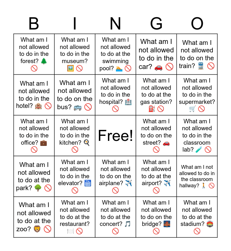 This bingo card has a free space and 33 words: What am I not allowed to do in the classroom? ๐ซ ๐คซ, What am I not allowed to do at the library? ๐ ๐ค, What am I not allowed to do in the kitchen? ๐ณ ๐ซ, What am I not allowed to do in the bathroom? ๐ฟ ๐ซ, What am I not allowed to do at the park? ๐ณ ๐ซ, What am I not allowed to do on the bus? ๐ ๐ซ, What am I not allowed to do on the train? ๐ ๐ซ, What am I not allowed to do at the zoo? ๐ฆ ๐ซ, What am I not allowed to do in the museum? ๐ผ๏ธ ๐ซ, What am I not allowed to do at the cinema? ๐ฌ ๐ซ, What am I not allowed to do in the hospital? ๐ฅ ๐ซ, What am I not allowed to do at the swimming pool? ๐ ๐ซ, What am I not allowed to do in the gym? ๐๏ธ ๐ซ, What am I not allowed to do at the playground? ๐ ๐ซ, What am I not allowed to do on the street? ๐ ๐ซ, What am I not allowed to do in the supermarket? ๐ ๐ซ, What am I not allowed to do at the restaurant? ๐ฝ๏ธ ๐ซ, What am I not allowed to do in the office? ๐ผ ๐ซ, What am I not allowed to do in the elevator? ๐ ๐ซ, What am I not allowed to do at the airport? โ๏ธ ๐ซ, What am I not allowed to do on the airplane? โ๏ธ ๐ซ, What am I not allowed to do at the beach? ๐๏ธ ๐ซ, What am I not allowed to do in the forest? ๐ฒ ๐ซ, What am I not allowed to do in the classroom lab? ๐งช ๐ซ, What am I not allowed to do at the concert? ๐ต ๐ซ, What am I not allowed to do at the stadium? ๐๏ธ ๐ซ, What am I not allowed to do in the car? ๐ ๐ซ, What am I not allowed to do at the gas station? โฝ ๐ซ, What am I not allowed to do in the hotel? ๐จ ๐ซ, What am I not allowed to do in the classroom hallway? ๐ถ ๐ซ, What am I not allowed to do at the store? ๐ฌ ๐ซ, What am I not allowed to do on the bridge? ๐ ๐ซ and What am I not allowed to do in the garden? ๐ธ ๐ซ.