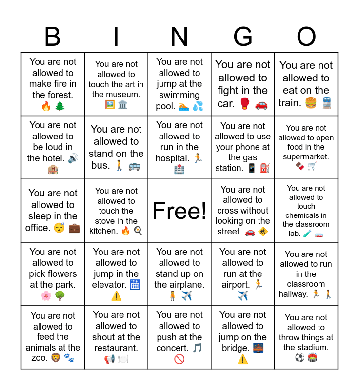 This bingo card has a free space and 33 words: You are not allowed to run in the classroom. ๐ ๐ซ, You are not allowed to shout at the library. ๐ข ๐, You are not allowed to touch the stove in the kitchen. ๐ฅ ๐ณ, You are not allowed to play with water in the bathroom. ๐ง ๐ฟ, You are not allowed to pick flowers at the park. ๐ธ ๐ณ, You are not allowed to stand on the bus. ๐ถ ๐, You are not allowed to eat on the train. ๐ ๐, You are not allowed to feed the animals at the zoo. ๐ฆ ๐พ, You are not allowed to touch the art in the museum. ๐ผ๏ธ ๐๏ธ, You are not allowed to talk loudly at the cinema. ๐คซ ๐ฌ, You are not allowed to run in the hospital. ๐ ๐ฅ, You are not allowed to jump at the swimming pool. ๐ ๐ฆ, You are not allowed to drop weights in the gym. ๐๏ธ ๐ช, You are not allowed to push at the playground. ๐ ๐ฆ, You are not allowed to cross without looking on the street. ๐ ๐ธ, You are not allowed to open food in the supermarket. ๐ซ ๐, You are not allowed to shout at the restaurant. ๐ข ๐ฝ๏ธ, You are not allowed to sleep in the office. ๐ด ๐ผ, You are not allowed to jump in the elevator. ๐ โ ๏ธ, You are not allowed to run at the airport. ๐ โ๏ธ, You are not allowed to stand up on the airplane. ๐ง โ๏ธ, You are not allowed to litter at the beach. ๐๏ธ ๐๏ธ, You are not allowed to make fire in the forest. ๐ฅ ๐ฒ, You are not allowed to touch chemicals in the classroom lab. ๐งช ๐งซ, You are not allowed to push at the concert. ๐ต ๐ซ, You are not allowed to throw things at the stadium. โฝ ๐๏ธ, You are not allowed to fight in the car. ๐ฅ ๐, You are not allowed to use your phone at the gas station. ๐ฑ โฝ, You are not allowed to be loud in the hotel. ๐ ๐จ, You are not allowed to run in the classroom hallway. ๐ ๐ถ, You are not allowed to steal at the store. ๐๏ธ ๐ฌ, You are not allowed to jump on the bridge. ๐ โ ๏ธ and You are not allowed to step on plants in the garden. ๐ฑ ๐ธ.