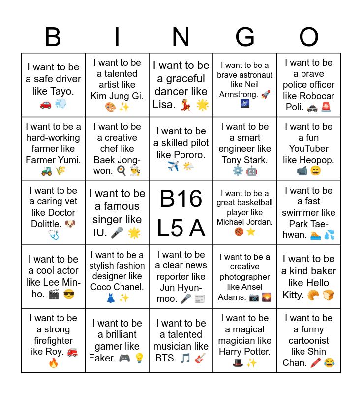 This bingo card has a free space and 33 words: I want to be a kind teacher like Anne Sullivan. ๐ ๐ฉโ๐ซ, I want to be a smart doctor like Doctor Lee Taesuk. ๐ฉบ ๐, I want to be a famous singer like IU. ๐ค ๐, I want to be a great soccer player like Son Heung-min. โฝ โญ, I want to be a cool actor like Lee Min-ho. ๐ฌ ๐, I want to be a creative chef like Baek Jong-won. ๐ณ ๐จโ๐ณ, I want to be a brave police officer like Robocar Poli. ๐ ๐จ, I want to be a strong firefighter like Roy. ๐ ๐ฅ, I want to be a talented artist like Kim Jung Gi. ๐จ โจ, I want to be a curious scientist like Albert Einstein. ๐ฌ ๐งช, I want to be a skilled pilot like Pororo. โ๏ธ ๐ค๏ธ, I want to be a graceful dancer like Lisa. ๐ ๐, I want to be a creative writer like J.K. Rowling. โ๏ธ ๐, I want to be a strong baseball player like Ryu Hyun-jin. โพ ๐ช, I want to be a great basketball player like Michael Jordan. ๐ โญ, I want to be a fun YouTuber like Heopop. ๐น ๐, I want to be a brilliant gamer like Faker. ๐ฎ ๐ก, I want to be a caring vet like Doctor Dolittle. ๐ถ ๐ฉบ, I want to be a stylish fashion designer like Coco Chanel. ๐ โจ, I want to be a creative photographer like Ansel Adams. ๐ท ๐, I want to be a clear news reporter like Jun Hyun-moo. ๐ค ๐ฐ, I want to be a strong builder like Bob the Builder. ๐๏ธ ๐จ, I want to be a safe driver like Tayo. ๐ ๐จ, I want to be a fast swimmer like Park Tae-hwan. ๐ ๐ฆ, I want to be a talented musician like BTS. ๐ต ๐ธ, I want to be a funny cartoonist like Shin Chan. ๐๏ธ ๐, I want to be a brave astronaut like Neil Armstrong. ๐ ๐, I want to be a smart engineer like Tony Stark. โ๏ธ ๐ค, I want to be a hard-working farmer like Farmer Yumi. ๐ ๐พ, I want to be a kind baker like Hello Kitty. ๐ฅ ๐, I want to be a caring nurse like Florence Nightingale. ๐ฅ ๐, I want to be a magical magician like Harry Potter. ๐ฉ โจ and I want to be a funny comedian like Yoo Jae-suk. ๐ ๐ค.