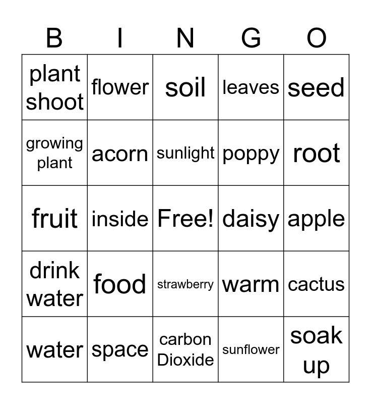This bingo card has a free space and 24 words: food, space, sunlight, water, seed, plant shoot, growing plant, flower, daisy, strawberry, poppy, fruit, warm, cactus, acorn, sunflower, apple, soil, root, inside, soak up, drink water, leaves and carbon Dioxide.