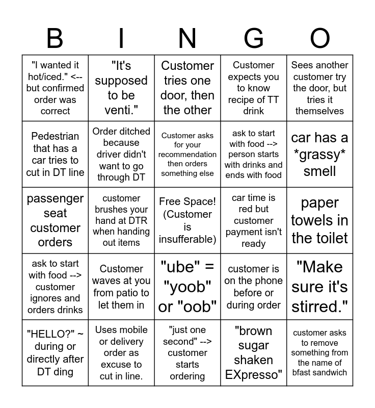 This bingo card has a free space and 29 words: "HELLO?" ~ during or directly after DT ding, Customer asks if the cafe will be closed indefinitely, customer brushes your hand at DTR when handing out items, "acai" = "ahkay", "I wanted it hot/iced." <-- but confirmed order was correct, Customer tries one door, then the other, Order ditched because driver didn't want to go through DT, Customer waves at you from patio to let them in, car time is red but customer payment isn't ready, Uses mobile or delivery order as excuse to cut in line., paper towels in the toilet, customer asks to remove something from the name of bfast sandwich, "just one second" --> customer starts ordering, "brown sugar shaken EXpresso", car has a *grassy* smell, customer responds to "how are you?" with their order, "ube" = "yoob" or "oob", ask to start with food --> customer ignores and orders drinks, Sees another customer try the door, but tries it themselves, passenger seat customer orders, customer is on the phone before or during order, Partner complains when cafe is reopened, ask to start with food --> person starts with drinks and ends with food, Pedestrian that has a car tries to cut in DT line, Customer expects you to know recipe of TT drink, "It's supposed to be venti.", "Make sure it's stirred.", Customer asks for your recommendation then orders something else and Customer asks for extra extra caramel.