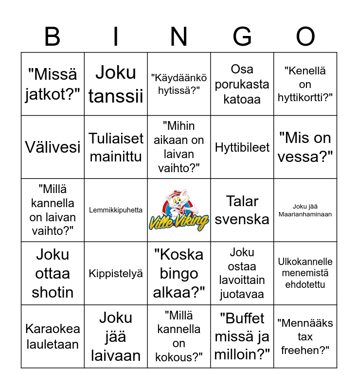 This bingo card has a free space and 24 words: Kippistelyä, Joku jää laivaan, "Mihin aikaan on laivan vaihto?", Karaokea lauletaan, "Kenellä on hyttikortti?", "Missä jatkot?", Välivesi, Joku tanssii, Talar svenska, "Koska bingo alkaa?", Hyttibileet, "Millä kannella on laivan vaihto?", Joku ostaa lavoittain juotavaa, Ulkokannelle menemistä ehdotettu, Tuliaiset mainittu, "Buffet missä ja milloin?", Joku jää Maarianhaminaan, "Käydäänkö hytissä?", "Mis on vessa?", Lemmikkipuhetta, "Mennääks tax freehen?", Joku ottaa shotin, Osa porukasta katoaa and "Millä kannella on kokous?".