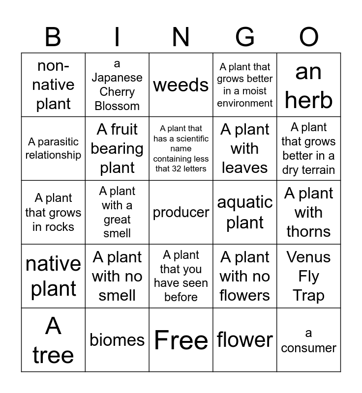 This bingo card has 25 words: native plant, biomes, producer, flower, an herb, non-native plant, a Japanese Cherry Blossom, weeds, aquatic plant, Venus Fly Trap, A parasitic relationship, A fruit bearing plant, Free, A plant with no flowers, A plant that grows better in a dry terrain, A tree, A plant with a great smell, A plant that has a scientific name containing less that 32 letters, A plant with leaves, A plant with thorns, A plant that grows in rocks, A plant with no smell, A plant that you have seen before, A plant that grows better in a moist environment and a consumer.