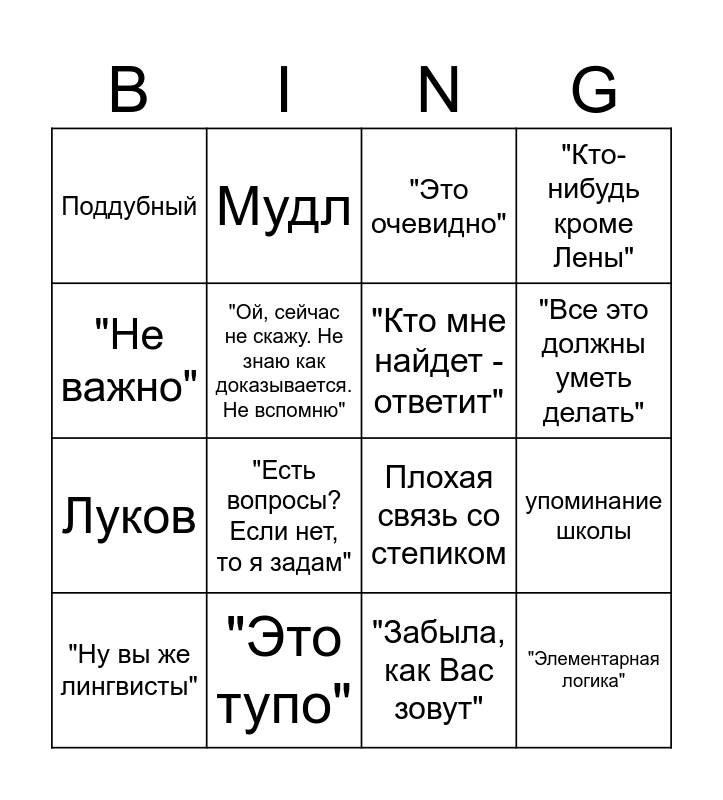 This bingo card has 16 words: "Это тупо", упоминание школы, "Это очевидно", Поддубный, Луков, Мудл, Плохая связь со степиком, "Забыла, как Вас зовут", "Не важно", "Ой, сейчас не скажу. Не знаю как доказывается. Не вспомню", "Ну вы же лингвисты", "Кто-нибудь кроме Лены", "Есть вопросы? Если нет, то я задам", "Все это должны уметь делать", "Кто мне найдет - ответит" and "Элементарная логика".