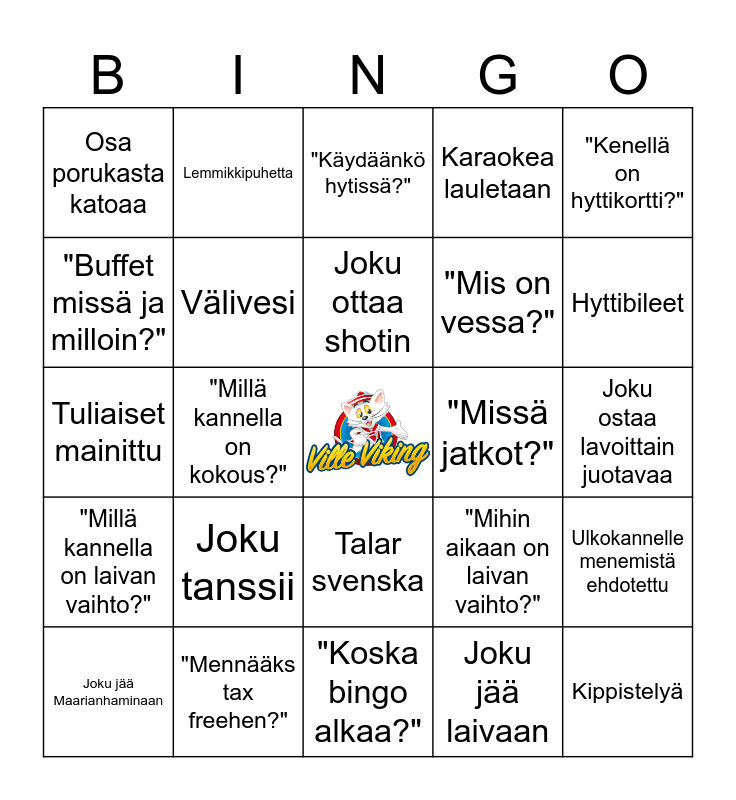 This bingo card has a free space and 24 words: Joku tanssii, "Mennääks tax freehen?", Joku ottaa shotin, Joku jää Maarianhaminaan, "Kenellä on hyttikortti?", Osa porukasta katoaa, "Buffet missä ja milloin?", Lemmikkipuhetta, "Missä jatkot?", Talar svenska, "Mis on vessa?", Tuliaiset mainittu, "Mihin aikaan on laivan vaihto?", Ulkokannelle menemistä ehdotettu, Välivesi, Joku jää laivaan, Joku ostaa lavoittain juotavaa, "Käydäänkö hytissä?", Hyttibileet, "Millä kannella on kokous?", Kippistelyä, "Millä kannella on laivan vaihto?", Karaokea lauletaan and "Koska bingo alkaa?".