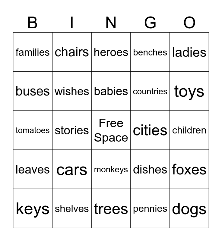 This bingo card has a free space and 48 words: cats, dogs, books, trees, cars, flowers, chairs, apples, buses, boxes, wishes, benches, foxes, dishes, glasses, buzzes, babies, cities, parties, ladies, stories, pennies, families, countries, boys, toys, keys, days, monkeys, leaves, wolves, knives, lives, selves, shelves, men, women, children, feet, teeth, mice, geese, heroes, potatoes, tomatoes, cacti, foci and analyses.