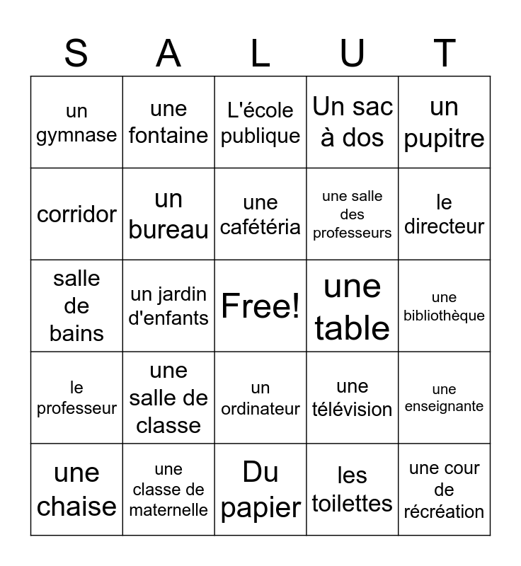 This bingo card has a free space and 24 words: une salle de classe, une classe de maternelle, une cafétéria, une chaise, un pupitre, un gymnase, corridor, une fontaine, une table, un ordinateur, une salle des professeurs, salle de bains, une télévision, une enseignante, un bureau, les toilettes, une bibliothèque, L'école publique, le directeur, un jardin d'enfants, une cour de récréation, le professeur, Un sac à dos and Du papier.