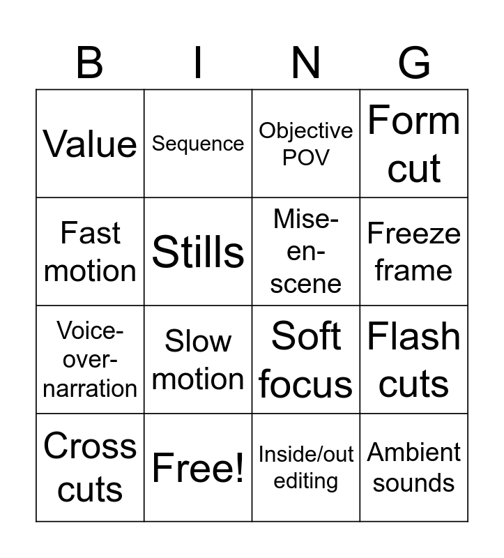 This bingo card has 22 words: Free!, Scene, Sequence, Establishing shot, Stills, Mise-en-scene, Value, Objective POV, Soft focus, Ambient sounds, Voice-over-narration, Form cut, Fade in/out, Outside/in editing, Inside/out editing, Glancing rhythms, Flash cuts, Cross cuts, Slow motion, Fast motion, Freeze frame and Montage.