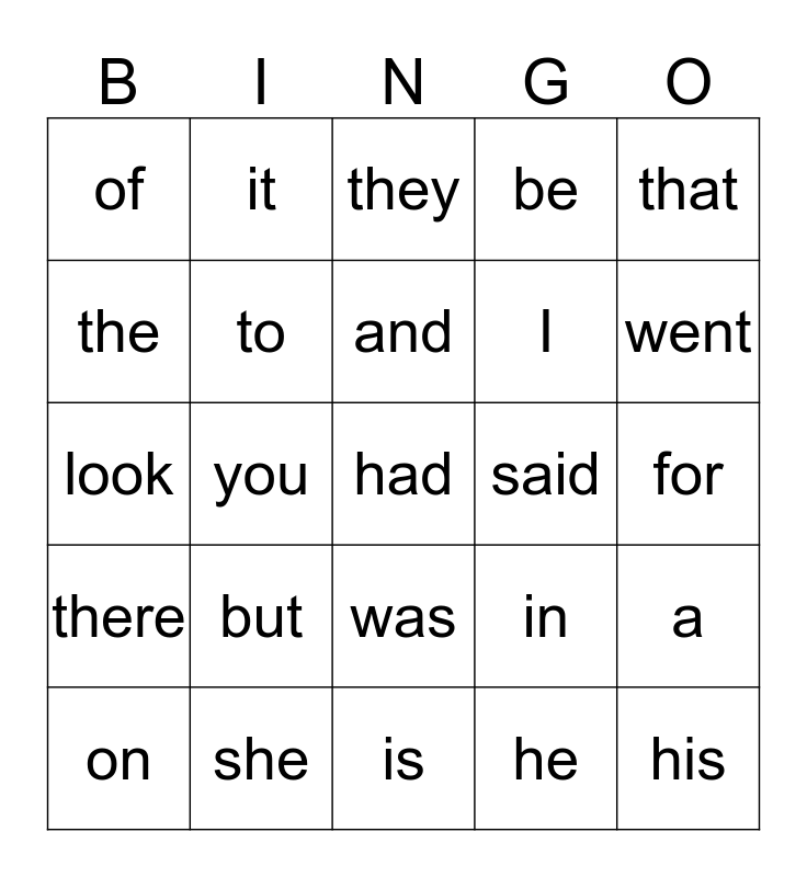 This bingo card has 25 words: but, is, and, on, that, of, the, it, said, was, I, look, in, a, to, his, for, they, went, you, had, she, there, be and he.
