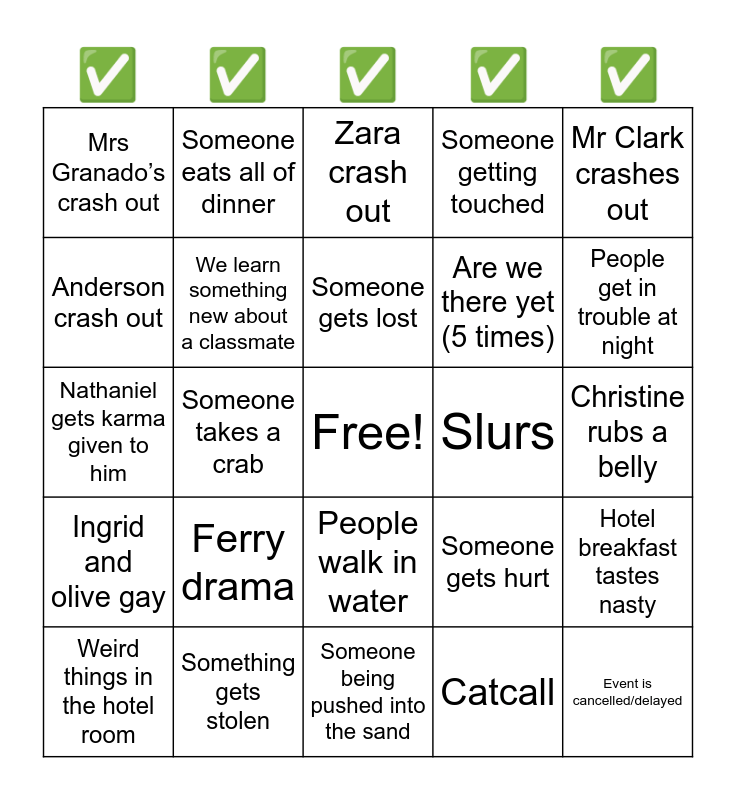 This bingo card has a free space and 24 words: Weird things in the hotel room, Ferry drama, Someone gets lost, Catcall, Mr Clark crashes out, Mrs Granado’s crash out, Someone eats all of dinner, Zara crash out, Slurs, Christine rubs a belly, Nathaniel gets karma given to him, We learn something new about a classmate, Someone gets hurt, Hotel breakfast tastes nasty, Anderson crash out, Something gets stolen, Someone being pushed into the sand, Someone getting touched, People get in trouble at night, Ingrid and olive gay, Someone takes a crab, People walk in water, Are we there yet (5 times) and Event is cancelled/delayed.