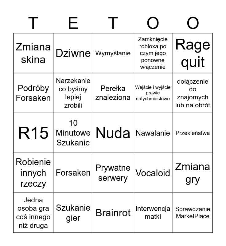This bingo card has a free space and 24 words: Forsaken, Szukanie gier, Perełka znaleziona, Jedna osoba gra coś innego niż druga, Rage quit, Zmiana skina, Podróby Forsaken, Dziwne, Nawalanie, Prywatne serwery, Wejście i wyjście prawie natychmiastowe, R15, Vocaloid, Zmiana gry, Narzekanie co byśmy lepiej zrobili, Interwencja matki, Przekleństwa, Wymyślanie, dołączenie do znajomych lub na obrót, 10 Minutowe Szukanie, Sprawdzanie MarketPlace, Robienie innych rzeczy, Zamknięcie robloxa po czym jego ponowne włączenie and Brainrot.