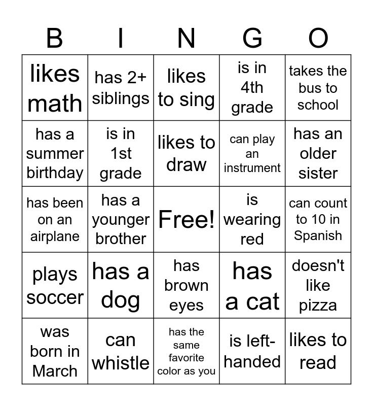 This bingo card has a free space and 24 words: has a dog, can whistle, likes to draw, was born in March, takes the bus to school, likes math, has a summer birthday, has 2+ siblings, is wearing red, has brown eyes, can play an instrument, has been on an airplane, has a cat, doesn't like pizza, is in 1st grade, is left-handed, can count to 10 in Spanish, likes to sing, has an older sister, has a younger brother, likes to read, plays soccer, is in 4th grade and has the same favorite color as you.