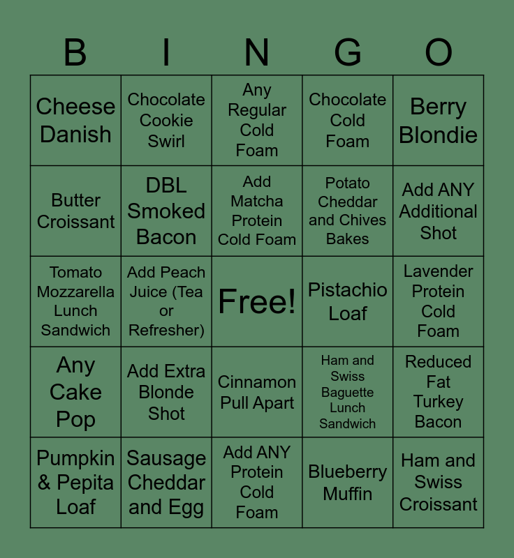 This bingo card has a free space and 25 words: Add Extra Blonde Shot, Add ANY Protein Cold Foam, Add Matcha Protein Cold Foam, Pumpkin & Pepita Loaf, Berry Blondie, Cheese Danish, Butter Croissant, Chocolate Cookie Swirl, Pistachio Loaf, Cinnamon Pull Apart, Potato Cheddar and Chives Bakes, Tomato Mozzarella Lunch Sandwich, Ham and Swiss Baguette Lunch Sandwich, Reduced Fat Turkey Bacon, DBL Smoked Bacon, Red Pepper Egg Bites, Lavender Protein Cold Foam, Any Regular Cold Foam, Add ANY Additional Shot, Add Peach Juice (Tea or Refresher), Ham and Swiss Croissant, Sausage Cheddar and Egg, Any Cake Pop, Chocolate Cold Foam and Blueberry Muffin.
