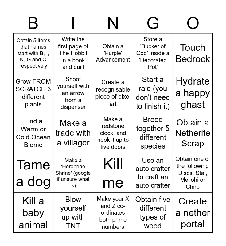 This bingo card has a free space and 24 words: Make a 'Herobrine Shrine' (google if unsure what is), Blow yourself up with TNT, Create a recognisable piece of pixel art, Kill a baby animal, Touch Bedrock, Obtain 5 items that names start with B, I, N, G and O respectively, Grow FROM SCRATCH 3 different plants, Write the first page of The Hobbit in a book and quill, Breed together 5 different species, Kill me, Start a raid (you don't need to finish it), Find a Warm or Cold Ocean Biome, Use an auto crafter to craft an auto crafter, Obtain one of the following Discs: Stal, Mellohi or Chirp, Shoot yourself with an arrow from a dispenser, Obtain five different types of wood, Obtain a Netherite Scrap, Obtain a 'Purple' Advancement, Hydrate a happy ghast, Make a trade with a villager, Create a nether portal, Tame a dog, Store a 'Bucket of Cod' inside a 'Decorated Pot' and Make your X and Z co-ordinates both prime numbers.