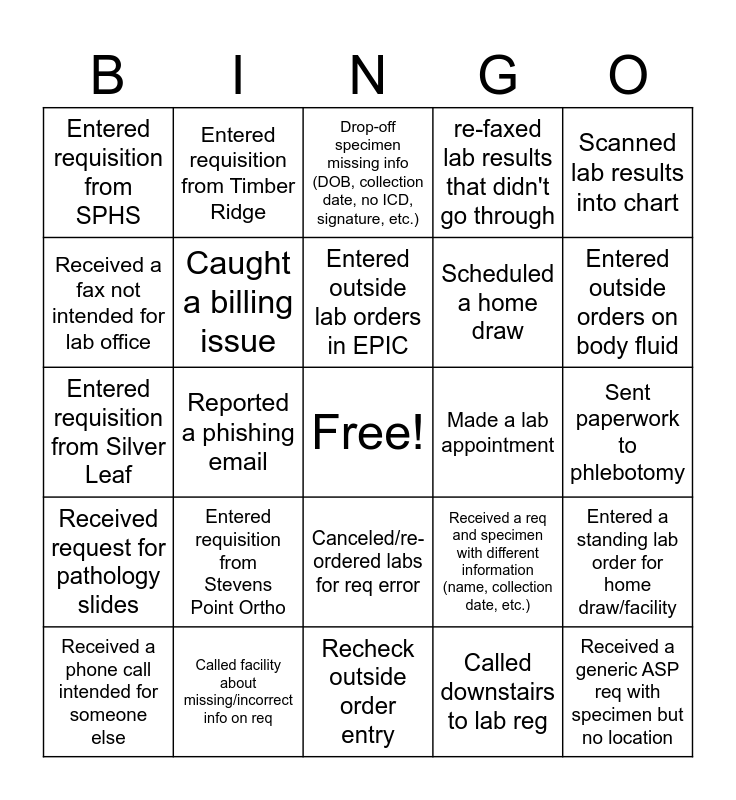 This bingo card has a free space and 24 words: Entered requisition from Stevens Point Ortho, Called facility about missing/incorrect info on req, Entered outside lab orders in EPIC, Received a phone call intended for someone else, Scanned lab results into chart, Entered requisition from SPHS, Received a fax not intended for lab office, Entered requisition from Timber Ridge, Made a lab appointment, Canceled/re-ordered labs for req error, Scheduled a home draw, Entered requisition from Silver Leaf, Received a req and specimen with different information (name, collection date, etc.), Entered a standing lab order for home draw/facility, Caught a billing issue, Called downstairs to lab reg, Sent paperwork to phlebotomy, Drop-off specimen missing info (DOB, collection date, no ICD, signature, etc.), Entered outside orders on body fluid, Reported a phishing email, Received a generic ASP req with specimen but no location, Received request for pathology slides, re-faxed lab results that didn't go through and Recheck outside order entry.