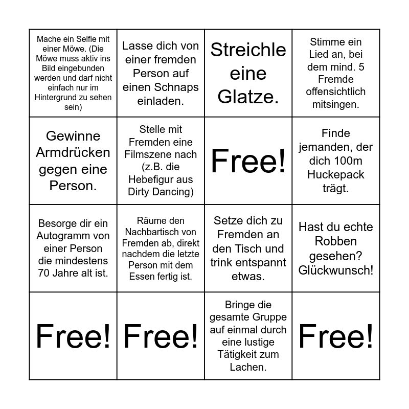 This bingo card has 19 words: Free!, Free!, Free!, Free!, Free!, Mache ein Selfie mit einer Möwe. (Die Möwe muss aktiv ins Bild eingebunden werden und darf nicht einfach nur im Hintergrund zu sehen sein), Räume den Nachbartisch von Fremden ab, direkt nachdem die letzte Person mit dem Essen fertig ist., Streichle eine Glatze., Stimme ein Lied an, bei dem mind. 5 Fremde offensichtlich mitsingen., Besorge dir ein Autogramm von einer Person die mindestens 70 Jahre alt ist., Lasse dich von einer fremden Person auf einen Schnaps einladen., Setze dich zu Fremden an den Tisch und trink entspannt etwas., Hast du echte Robben gesehen? Glückwunsch!, Mache eine Durchsage durch ein Restaurant/Bar/Club., Stelle mit Fremden eine Filmszene nach (z.B. die Hebefigur aus Dirty Dancing), Bringe die gesamte Gruppe auf einmal durch eine lustige Tätigkeit zum Lachen., Finde jemanden, der dich 100m Huckepack trägt., Gewinne Armdrücken gegen eine Person. and Rufe laut am Stand: „Rettet die Wale und Findet Nemo!“.