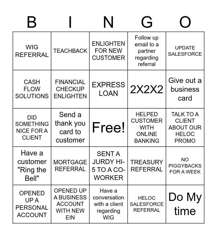 This bingo card has a free space and 24 words: MORTGAGE REFERRAL, OPENED UP A BUSINESS ACCOUNT WITH NEW EIN, EXPRESS LOAN, OPENED UP A PERSONAL ACCOUNT, UPDATE SALESFORCE, WIG REFERRAL, CASH FLOW SOLUTIONS, TEACHBACK, HELPED CUSTOMER WITH ONLINE BANKING, SENT A JURDY HI-5 TO A CO-WORKER, 2X2X2, DID SOMETHING NICE FOR A CLIENT, TREASURY REFERRAL, NO PIGGYBACKS FOR A WEEK, FINANCIAL CHECKUP ENLIGHTEN, HELOC SALESFORCE REFERRAL, TALK TO A CLIENT ABOUT OUR HELOC PROMO, ENLIGHTEN FOR NEW CUSTOMER, Give out a business card, Send a thank you card to customer, Do My time, Have a customer "Ring the Bell", Follow up email to a partner regarding referral and Have a conversation with a client regarding WIG.