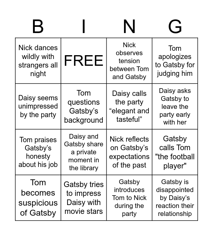This bingo card has 20 words: Gatsby calls Tom "the football player", Daisy attends one of Gatsby’s parties, Nick observes tension between Tom and Gatsby, Gatsby ignores Daisy most of the night, Tom becomes suspicious of Gatsby, Daisy seems unimpressed by the party, Gatsby tries to impress Daisy with movie stars, Nick dances wildly with strangers all night, Tom praises Gatsby’s honesty about his job, FREE, Daisy and Gatsby share a private moment in the library, Nick reflects on Gatsby’s expectations of the past, Tom questions Gatsby’s background, Gatsby is disappointed by Daisy’s reaction their relationship, Daisy calls the party “elegant and tasteful”, Nick senses growing conflict between Tom and Gatsby, Daisy asks Gatsby to leave the party early with her, Tom apologizes to Gatsby for judging him, Gatsby introduces Tom to Nick during the party and Daisy tells Gatsby the party makes her uncomfortable.