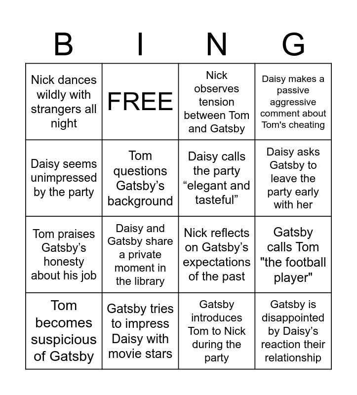 This bingo card has 20 words: Gatsby calls Tom "the football player", Daisy attends one of Gatsby’s parties, Nick observes tension between Tom and Gatsby, Gatsby ignores Daisy most of the night, Tom becomes suspicious of Gatsby, Daisy seems unimpressed by the party, Gatsby tries to impress Daisy with movie stars, Nick dances wildly with strangers all night, Tom praises Gatsby’s honesty about his job, FREE, Daisy and Gatsby share a private moment in the library, Nick reflects on Gatsby’s expectations of the past, Tom questions Gatsby’s background, Gatsby is disappointed by Daisy’s reaction their relationship, Daisy calls the party “elegant and tasteful”, Nick senses growing conflict between Tom and Gatsby, Daisy asks Gatsby to leave the party early with her, Daisy makes a passive aggressive comment about Tom's cheating, Gatsby introduces Tom to Nick during the party and Jordan Baker finds Nick at the party..