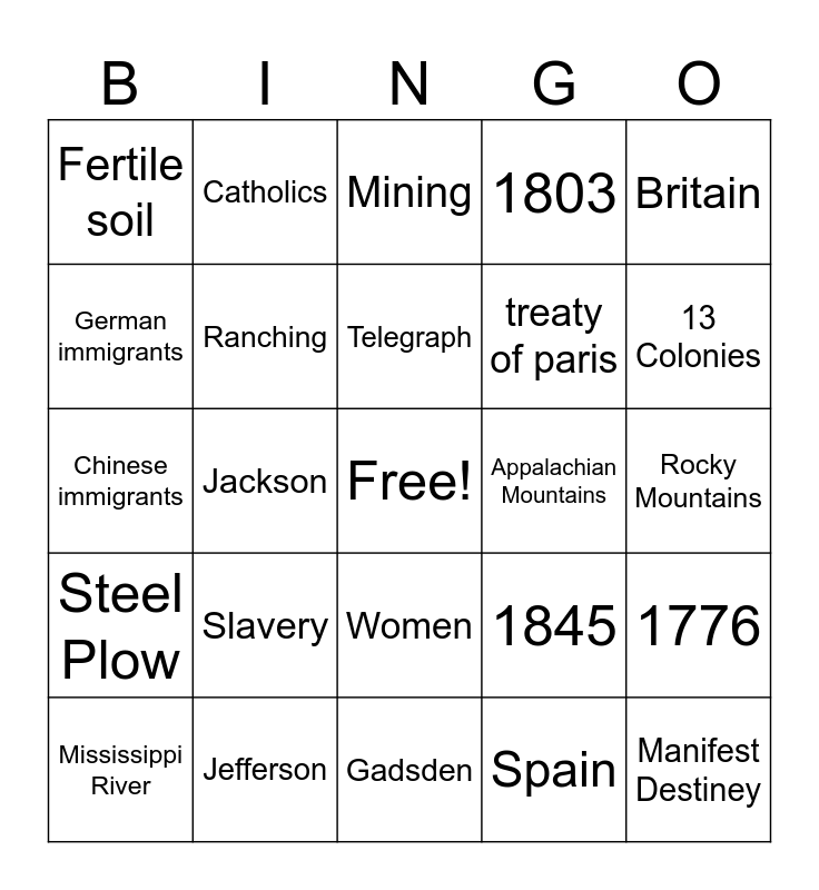 This bingo card has a free space and 24 words: Slavery, Jefferson, Telegraph, Mississippi River, Britain, Fertile soil, German immigrants, Catholics, Appalachian Mountains, Women, treaty of paris, Chinese immigrants, 1845, 1776, Ranching, Spain, Rocky Mountains, Mining, 13 Colonies, Jackson, Manifest Destiney, Steel Plow, 1803 and Gadsden.
