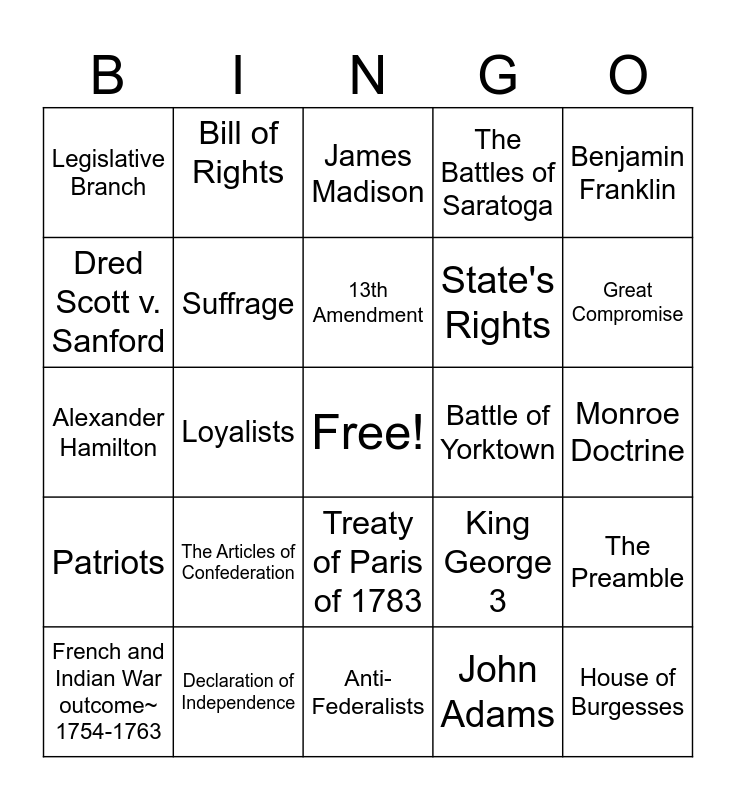 This bingo card has a free space and 44 words: Mayflower Compact, House of Burgesses, Fundamental Orders of Connecticut, French and Indian War outcome~ 1754-1763, George Washington, John Adams, James Madison, Thomas Jefferson, Benjamin Franklin, Declaration of Independence, The Battles of Saratoga, Battle of Yorktown, Treaty of Paris of 1783, The Articles of Confederation, Northwest Ordinance, Anti-Federalists, Representative Government, Alexander Hamilton, Ratification, Great Compromise, Bill of Rights, Executive Branch, Judicial Branch, Legislative Branch, Checks and Balances, Monroe Doctrine, War of 1812, Trail of Tears, King George 3, Patriots, Federalists, The Preamble, Plymouth, Massachusetts, Tarif, Loyalists, Reconstruction (1865-1877), 14th Amendment, 15th Amendment, 13th Amendment, Dred Scott v. Sanford, State's Rights, Abolitionist, Suffrage and William Lloyd Garrison.