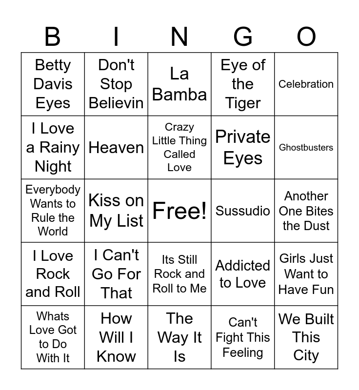 This bingo card has a free space and 64 words: Under Pressure, Come on Eileen, Livin on a Prayer, Girls Just Want to Have Fun, Pour Some Sugar on Me, Sweet Child o' Mine, Don't Stop Believin, I Wanna Dance With Somebody, Crazy Little Thing Called Love, Hungry Like the Wolf, Its Still Rock and Roll to Me, Magic, Another One Bites the Dust, Celebration, 9 to 5, I Love a Rainy Night, Kiss on My List, Betty Davis Eyes, Jessie's Girl, Private Eyes, I Can't Go For That, I Love Rock and Roll, Eye of the Tiger, Abracadabra, Africa, Billie Jean, Beat It, Let's Dance, Sweet Dreams (Are Made of This), Total Eclipse of the Heart, Karma Chameleon, Jump, Footloose, Let's Hear it For the Boy, Ghostbusters, Whats Love Got to Do With It, Wake Me Up Before you Go-Go, Can't Fight This Feeling, Don't You (Forget About Me), Heaven, Everybody Wants to Rule the World, Sussudio, The Power of Love, Money for Nothing, Take on Me, We Built This City, How Will I Know, Rock Me Amadeus, Addicted to Love, Papa Dont Preach, Higher Love, You Give Love a Bad Name, The Way It Is, Walk Like an Egyptian, Nothing's Going to Stop Us Now, You Keep Me Hanging On, La Bamba, Bad, Bad Medicine, Every Rose Has Its Thorn, We Didn't Start the Fire, Material Girl, I Think We Are Alone Now and Tainted Love.