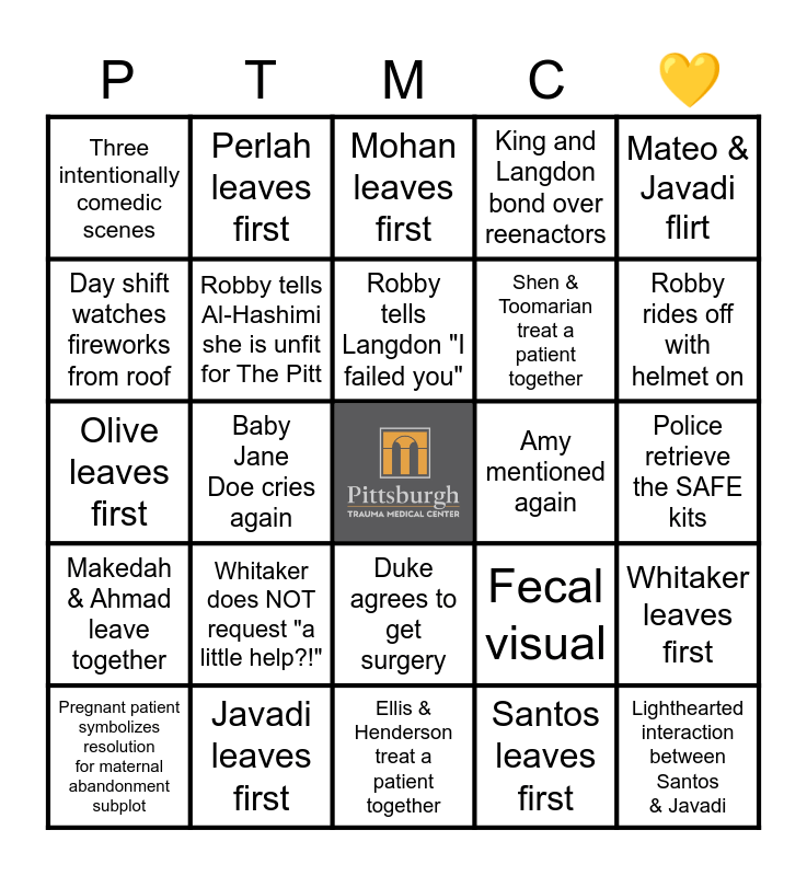 This bingo card has a free space and 39 words: Digby's heartfelt departure, Javadi tells her parents she will pursue emergency medicine, Dana cries, Robby tells Al-Hashimi she is unfit for The Pitt, Pregnant patient symbolizes resolution for maternal abandonment subplot, Duke agrees to get surgery, Robby tells Langdon "I failed you", Another (presumably) homeless patient checks in, Mateo & Javadi flirt, Makedah & Ahmad leave together, Baby Jane Doe cries again, King and Langdon bond over reenactors, Lighthearted interaction between Santos & Javadi, Police retrieve the SAFE kits, Amy mentioned again, Whitaker does NOT request "a little help?!", Mohan confides in Abbot, Three intentionally comedic scenes, One more patient gets a bed upstairs, Fecal visual, Day shift watches fireworks from roof, Ellis & Henderson treat a patient together, Shen & Toomarian treat a patient together, Robby rides off with helmet on, Whitaker's badge is found, Lena returns, Lena does not return, McKay leaves first, Vivi leaves first, Perlah leaves first, Langdon leaves first, King leaves first, Mohan leaves first, Javadi leaves first, Santos leaves first, Al-Hashimi leaves first, Whitaker leaves first, Olive leaves first and Whitaker's badge is not found.