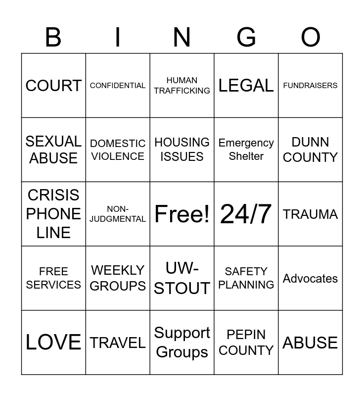 This bingo card has a free space and 24 words: LOVE, WEEKLY GROUPS, HOUSING ISSUES, PEPIN COUNTY, FUNDRAISERS, COURT, CONFIDENTIAL, HUMAN TRAFFICKING, 24/7, TRAUMA, CRISIS PHONE LINE, DOMESTIC VIOLENCE, SAFETY PLANNING, Advocates, SEXUAL ABUSE, TRAVEL, Support Groups, LEGAL, DUNN COUNTY, FREE SERVICES, NON-JUDGMENTAL, UW-STOUT, Emergency Shelter and ABUSE.