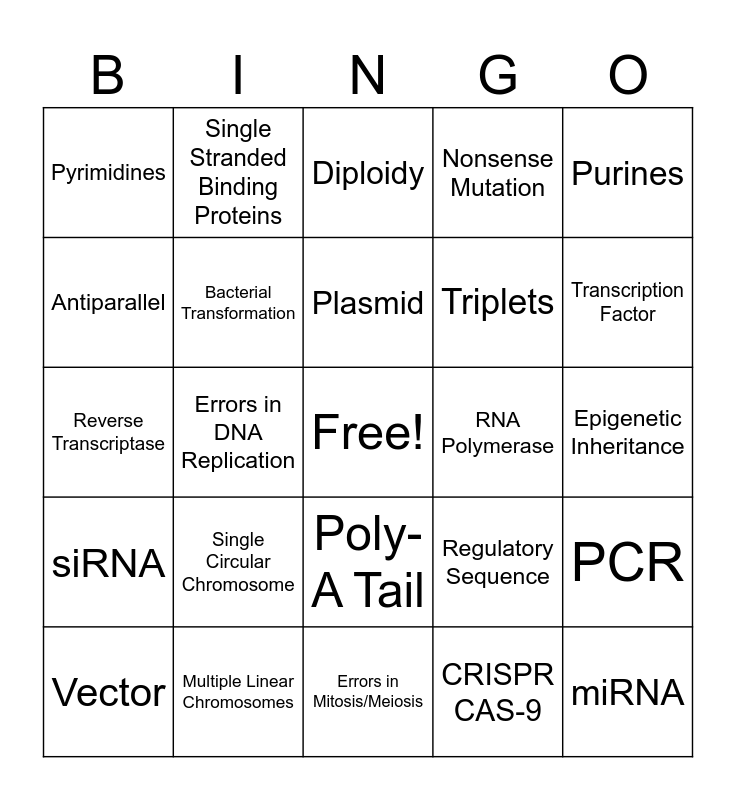 This bingo card has a free space and 24 words: Single Circular Chromosome, Multiple Linear Chromosomes, Plasmid, Vector, Purines, Pyrimidines, Antiparallel, Single Stranded Binding Proteins, RNA Polymerase, Poly-A Tail, Triplets, Reverse Transcriptase, Regulatory Sequence, PCR, Bacterial Transformation, CRISPR CAS-9, Epigenetic Inheritance, Diploidy, Transcription Factor, Errors in DNA Replication, miRNA, siRNA, Nonsense Mutation and Errors in Mitosis/Meiosis.