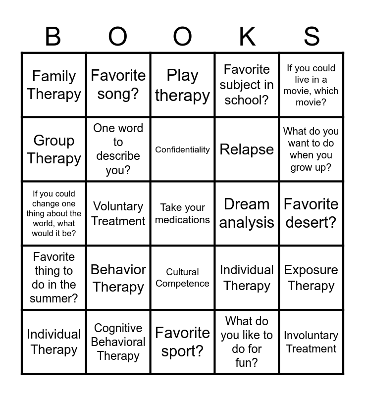 This bingo card has a free space and 24 words: Behavior Therapy, Cognitive Behavioral Therapy, Confidentiality, Individual Therapy, If you could live in a movie, which movie?, Family Therapy, Group Therapy, Favorite song?, Dream analysis, Cultural Competence, Relapse, If you could change one thing about the world, what would it be?, Individual Therapy, Exposure Therapy, One word to describe you?, What do you like to do for fun?, Favorite desert?, Play therapy, What do you want to do when you grow up?, Voluntary Treatment, Involuntary Treatment, Favorite thing to do in the summer?, Favorite subject in school? and Favorite sport?.