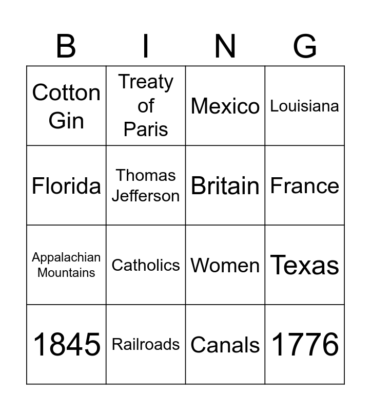 This bingo card has 20 words: Texas, 13 Colonies, Mexico, Slavery, 1845, Florida, Railroads, Cotton Gin, Appalachian Mountains, Treaty of Paris, Catholics, Women, Thomas Jefferson, 1776, Britain, Spain, France, Louisiana, Canals and Steel Plow.