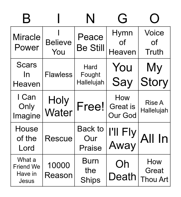 This bingo card has a free space and 65 words: Take Me Back, No Survivors, My Story Your Glory, All In, Women At The Well, Truth, I Believe You, I Know A Name, Hard Fought Hallelujah, Gratitude, Back to Our Praise, Graves Into Gardens, Rise A Hallelujah, Voice of Truth, Only Jesus, Scars In Heaven, Holy Water, Miracle Power, Child of Love, You Say, Rescue, House of the Lord, Hymn of Heaven, The King is in the Room, Way Maker, Old Rugged Cross, Amazing Grace, In The Garden, How Great Thou Art, It is Well with My Soul, What a Friend We Have in Jesus, Blessed Assurance, Precious Lord, Take My Hand, Just a Closer Walk With Thee, I'll Fly Away, 10000 Reason, Come to the Table, I Can Only Imagine, Oh Death, Even If, Flawless, Say I Won't, How Great is Our God, Proof, Good Good Father, Jesus Messiah, My Story, Redeemed, Thank You, Dusty Bibles, Your Ways Better, My Jesus, Evidence, Burn the Ships, For God is With Us, Relate, Still Water, Peace Be Still, Firm Foundation, Heaven on My Mind, Promise Land, I'm So Blessed, Build a Boat, Lead on Good Shepard and Not Where I Was.
