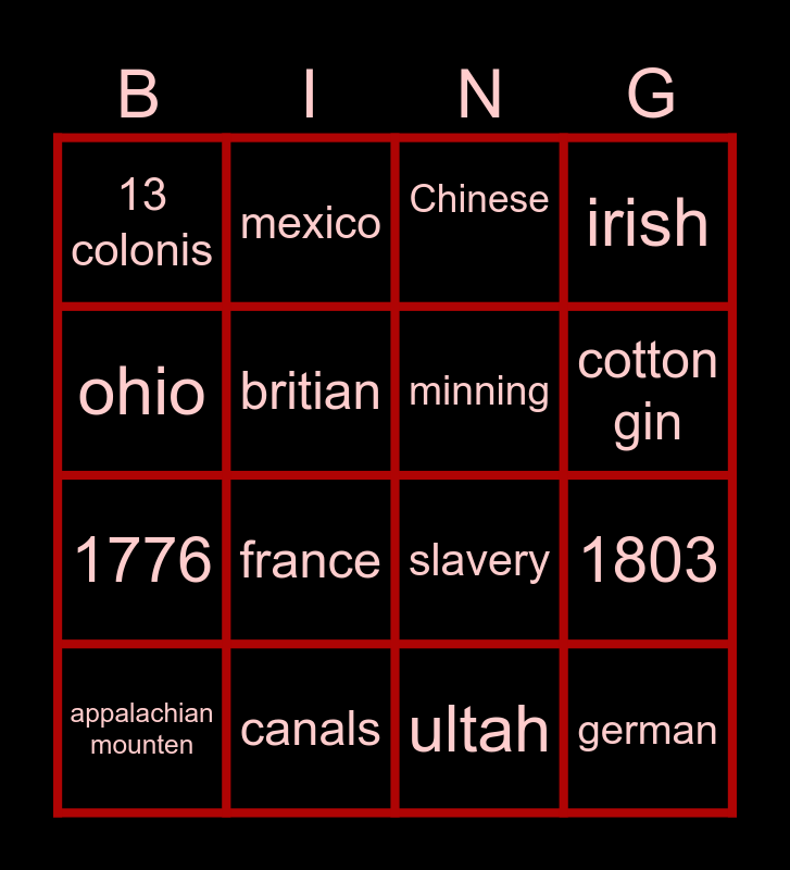 This bingo card has 16 words: canals, 1803, Chinese, 13 colonis, 1776, mexico, slavery, ultah, ohio, britian, appalachian mounten, irish, france, cotton gin, minning and german.